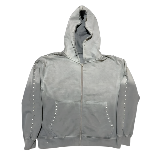 Grey Zip up Hoodie Sunfade Stacked Pants Set