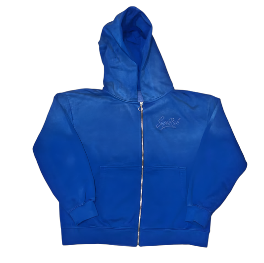 Blue Zip up Hoodie Sunfade Stacked Pants Set
