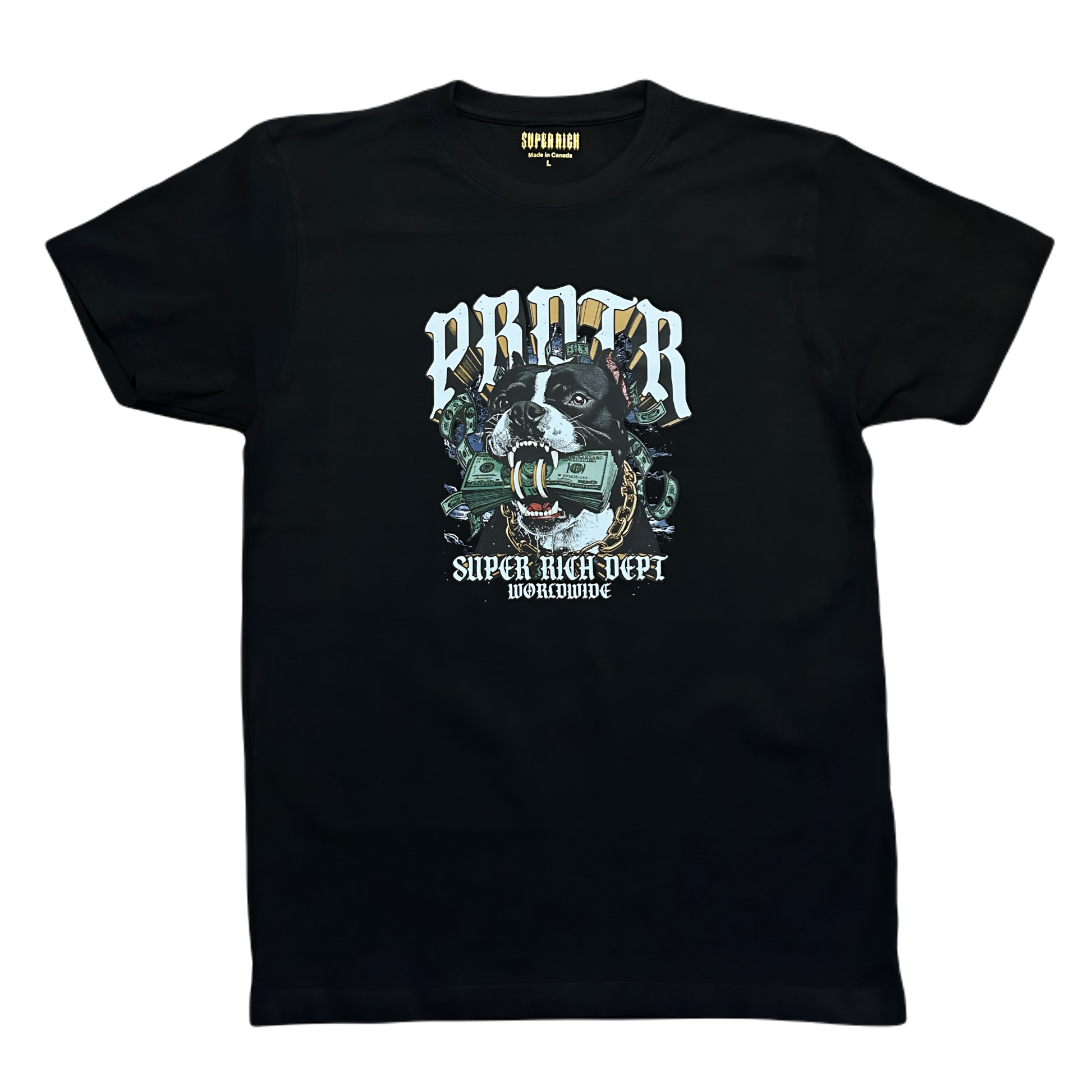 The PRDTR X Super Rich TEE. This premium tee features high-quality materials and a sleek design, perfect for elevating your wardrobe. Experience the comfort and style of the Super Rich TEE for yourself today.
