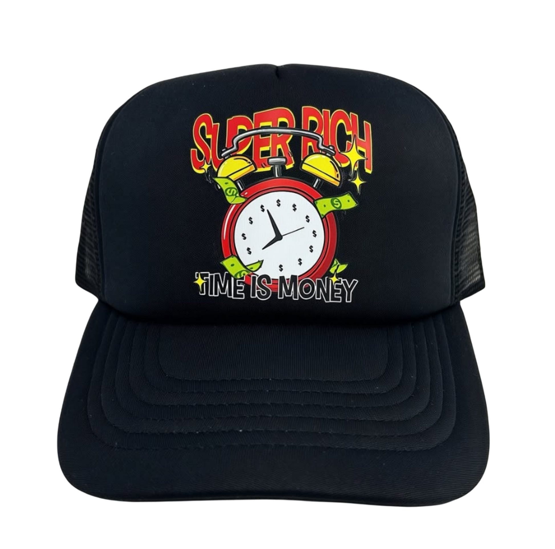 Times is Money Trucker hat. Made with premium foam material, mesh siding and an adjustable snapback, this hat is both comfortable and stylish. Available in black or two-tone black and white, it's the perfect accessory for any busy professional.