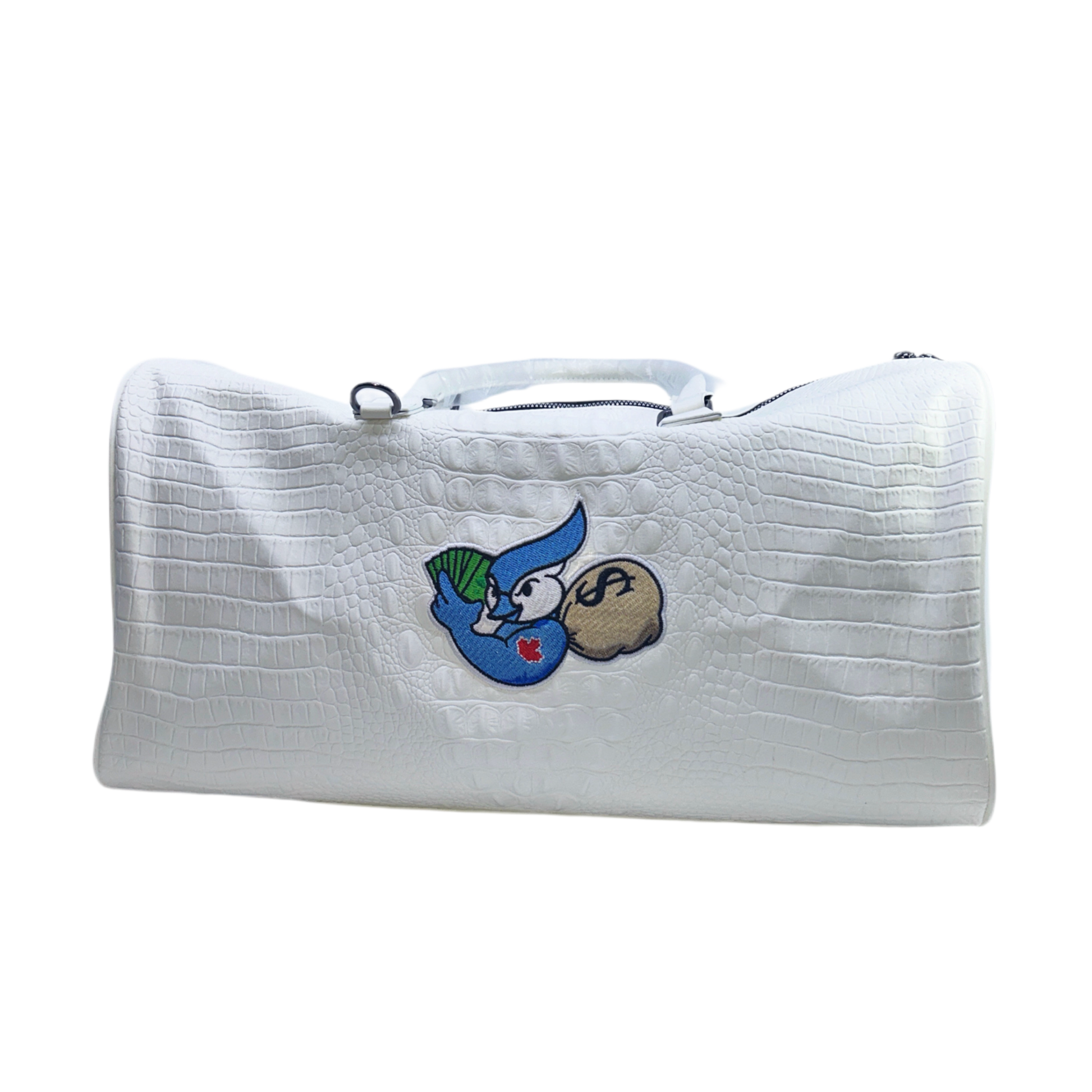 Live in luxury with the Toronto Money Jay Duffel. Made with sleek white vegan crocodile leather, this duffel bag boasts handles and a shoulder strap for effortless transportation. Elevate your travel game and make a statement with this luxurious accessory.
